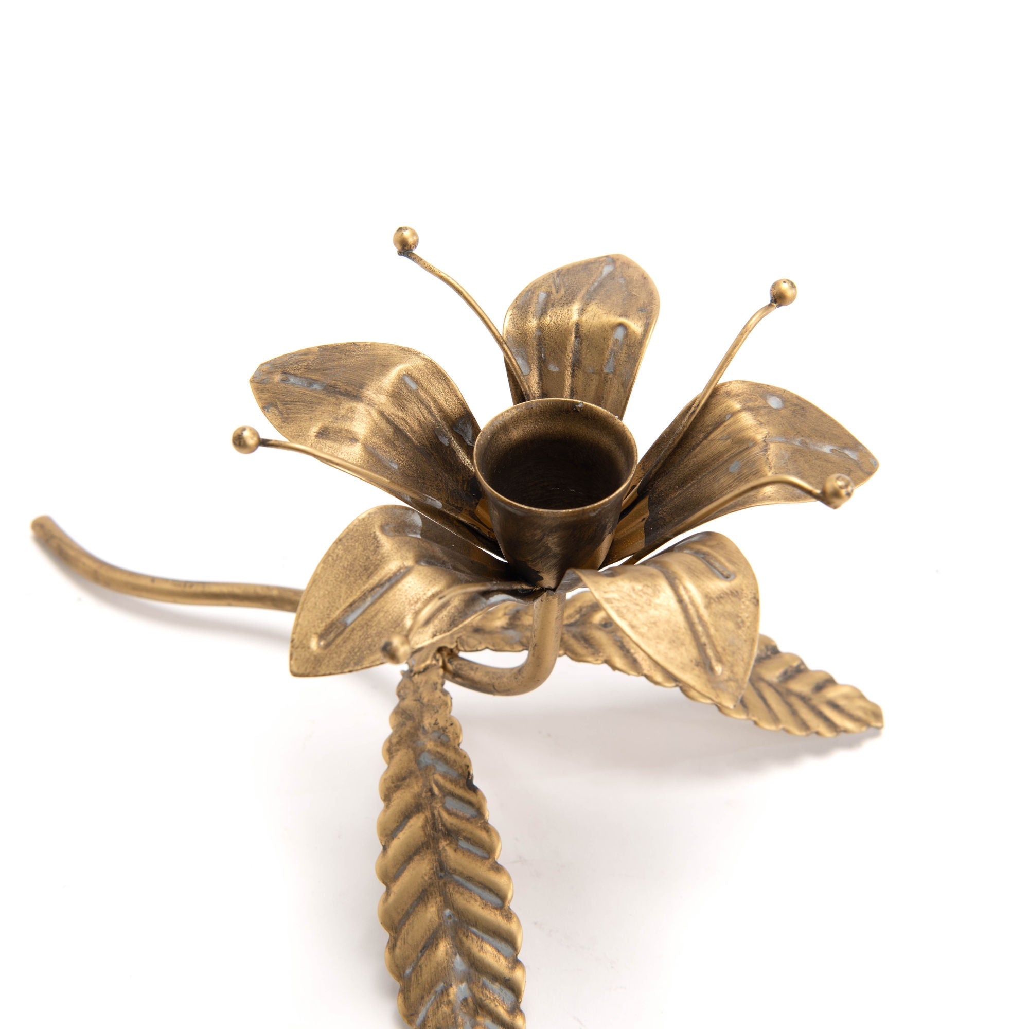 Elegante portavelas con base decorada modo de preciosa flor dorada.